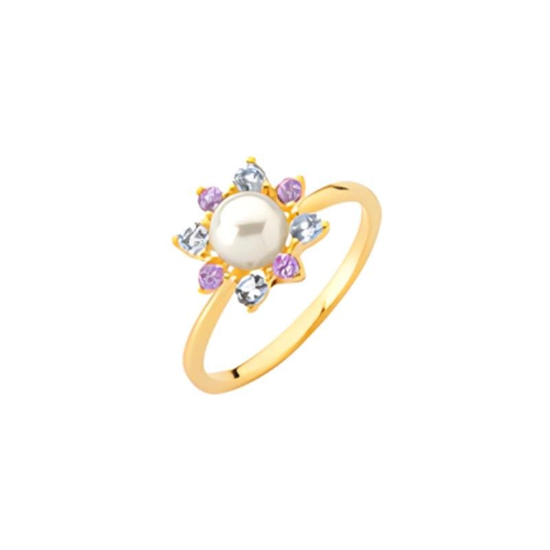 Coleção: RenascerAcabamento: Metal, 04 pedras zircônia redonda 2,00 mm ametista, 04 pedras zircônia redonda 2,50 mm água marinha e 01 pérola sintética redonda 6,00 mm meio furo.